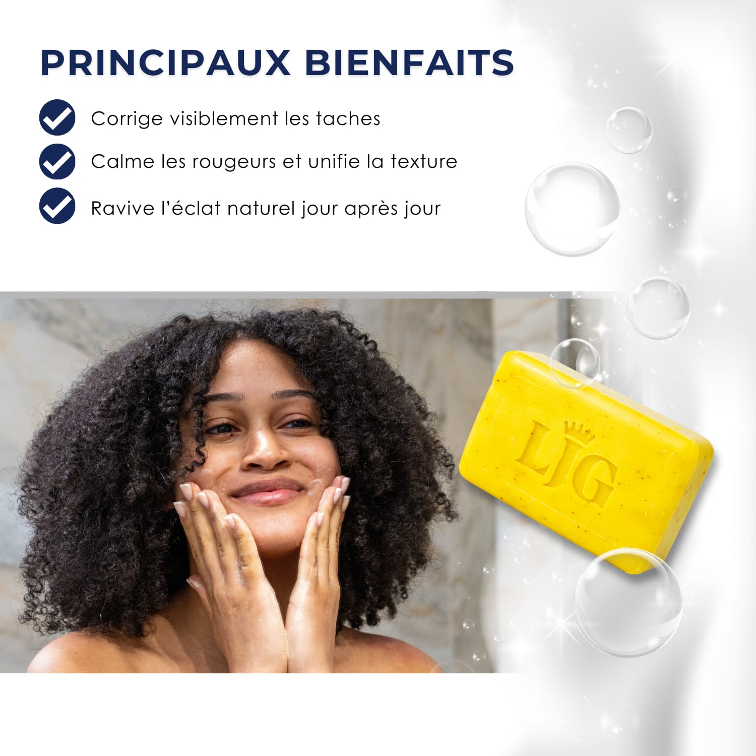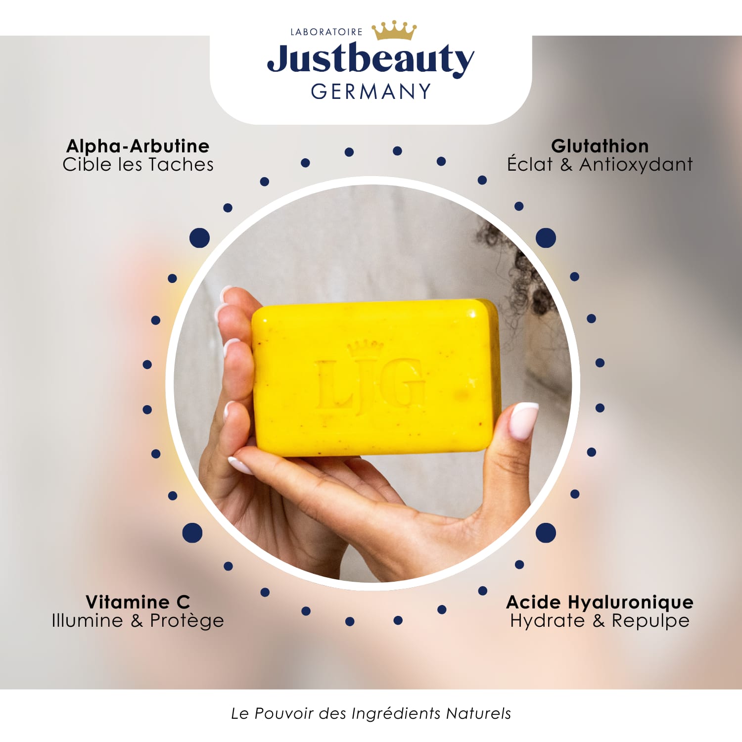 Conçu avec précision et expertise par Laboratoire Justbeauty Germany, ce savon 100% fabriqué en France est la solution ultime pour un teint uniforme, lumineux et visiblement plus clair.